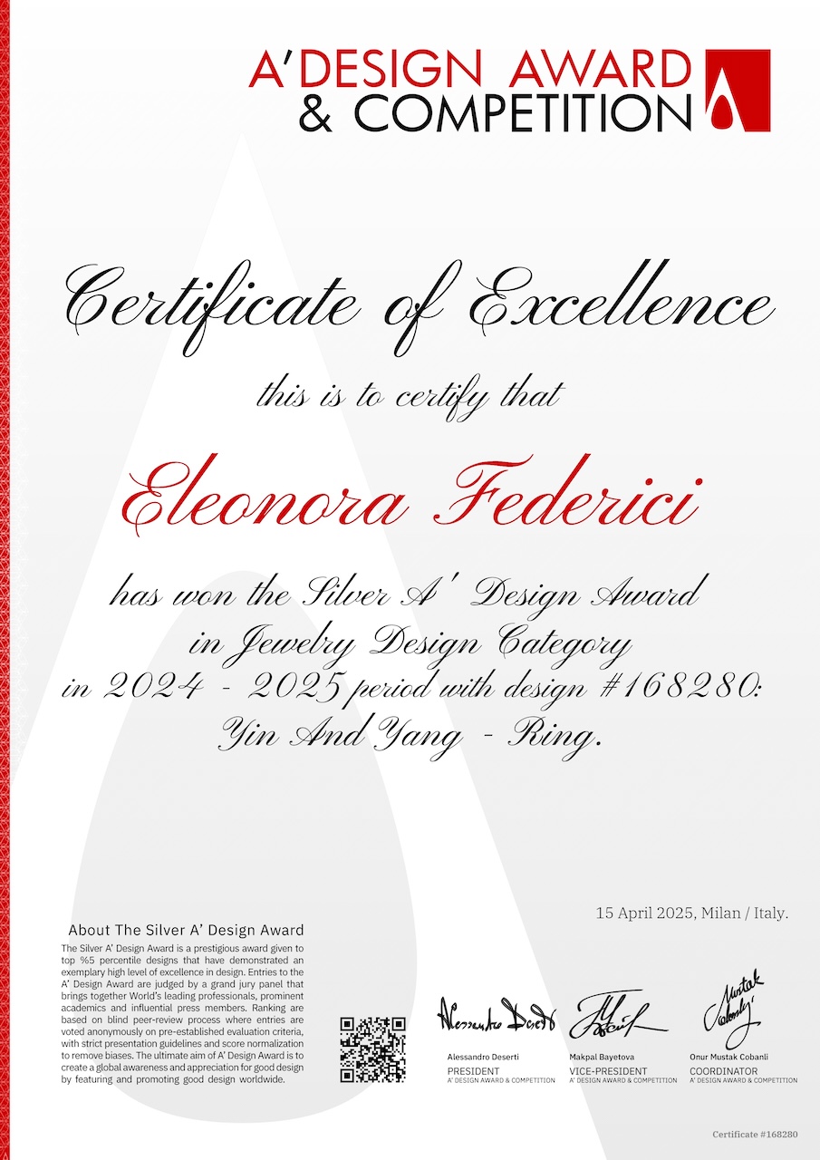 In 2021, I moved to Carlsbad (California, USA) where I completed the “Jewelry Design & Technology” Program at the world-renowned Gemological Institute of America (GIA), where I learned the latest state-of-art technologies in the field (CAD/CAM software) and where I was awarded the “Students’ Choice Award”.